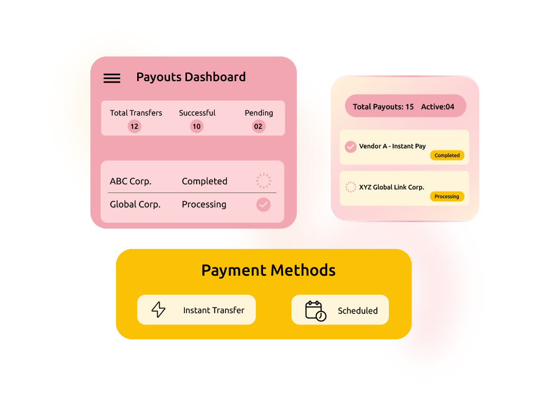 Our Payout Solution lets businesses send money to vendors, employees, and partners quickly. Upload recipient details, choose a method, and release multiple transfers in minutes.